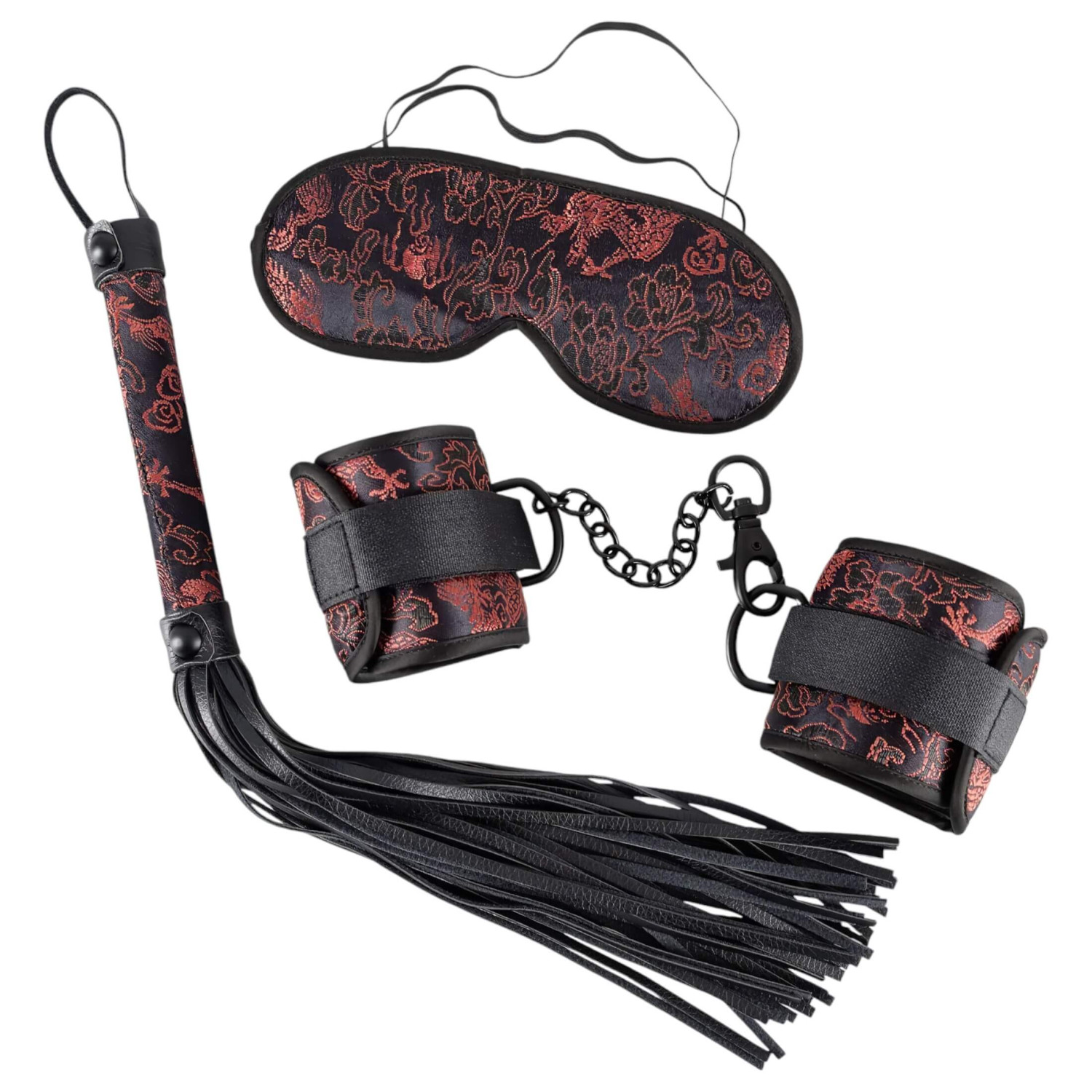 Objev nové dimenze vášně s tímto elegantním, tří dílným bondage setem z černého saténu s červeným vzorem.