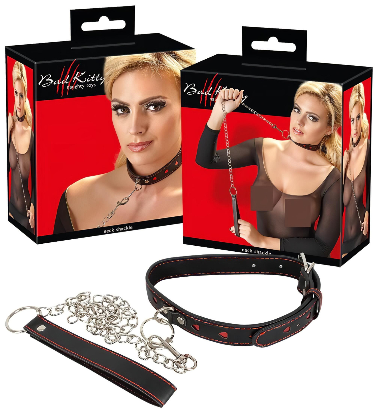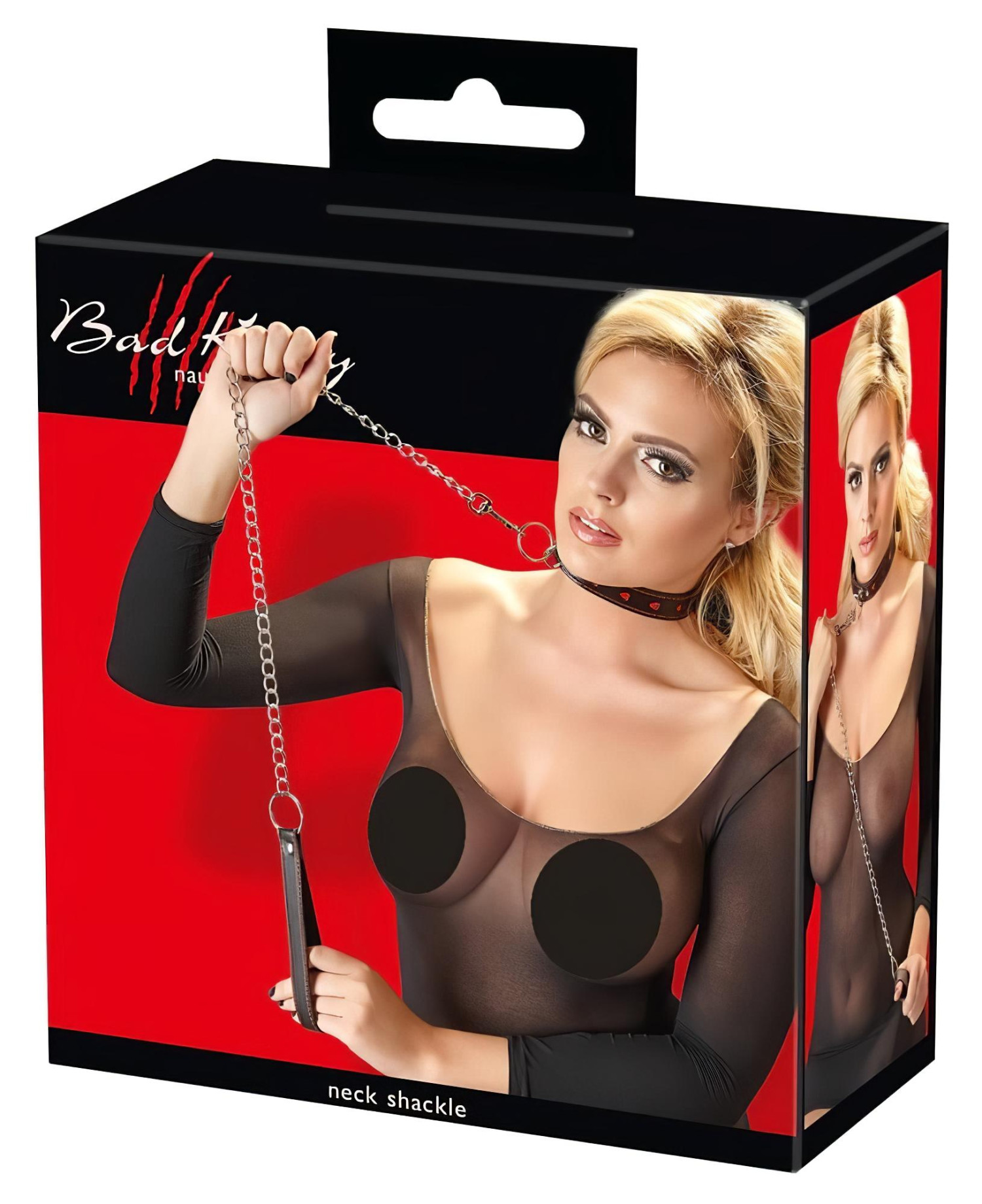 Názor Bad Kitty - obojek se srdíčky a kovovým vodítkem (černý)