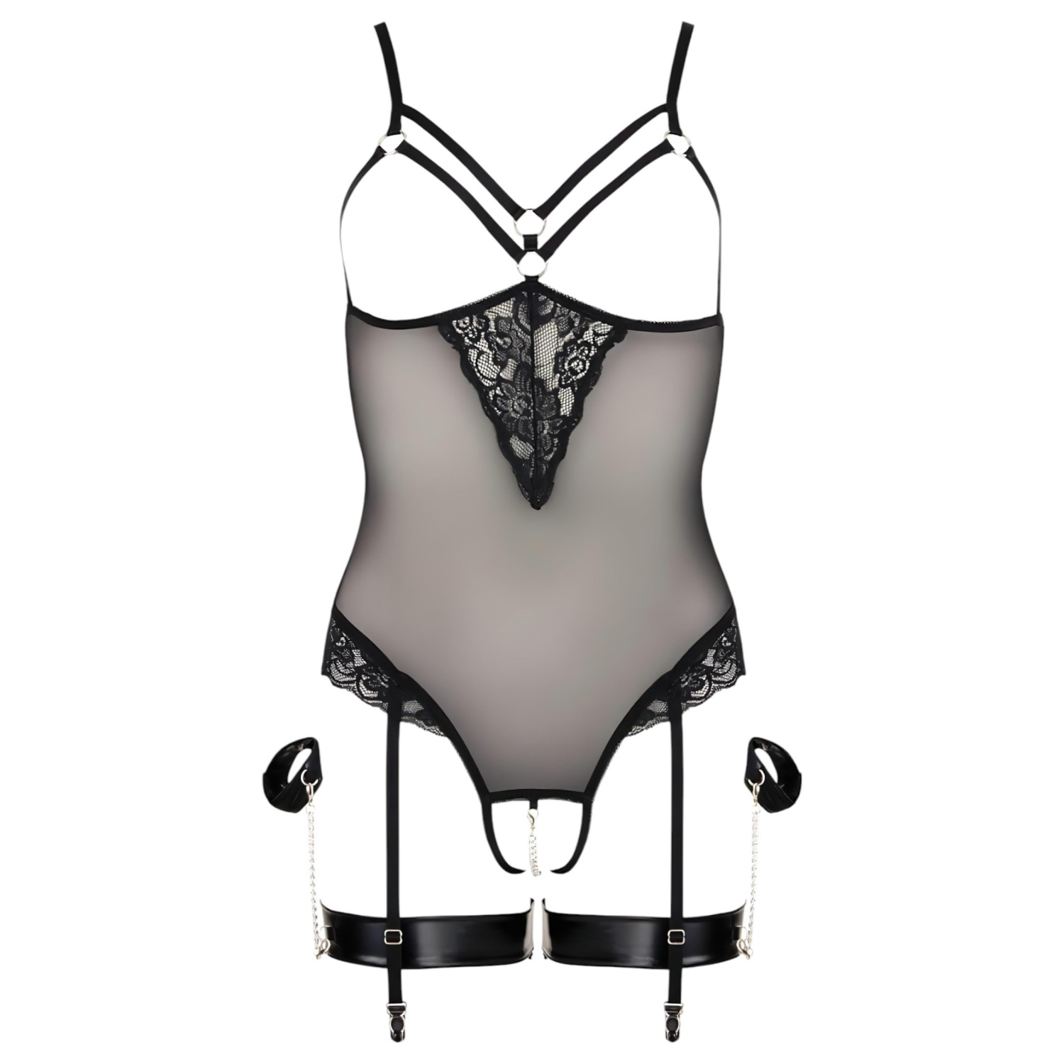 • Působení: Otevřená oblast prsou a rozkroku, odepínatelný kovový řetízek v rozkroku, nastavitelná ramínka i podvazky