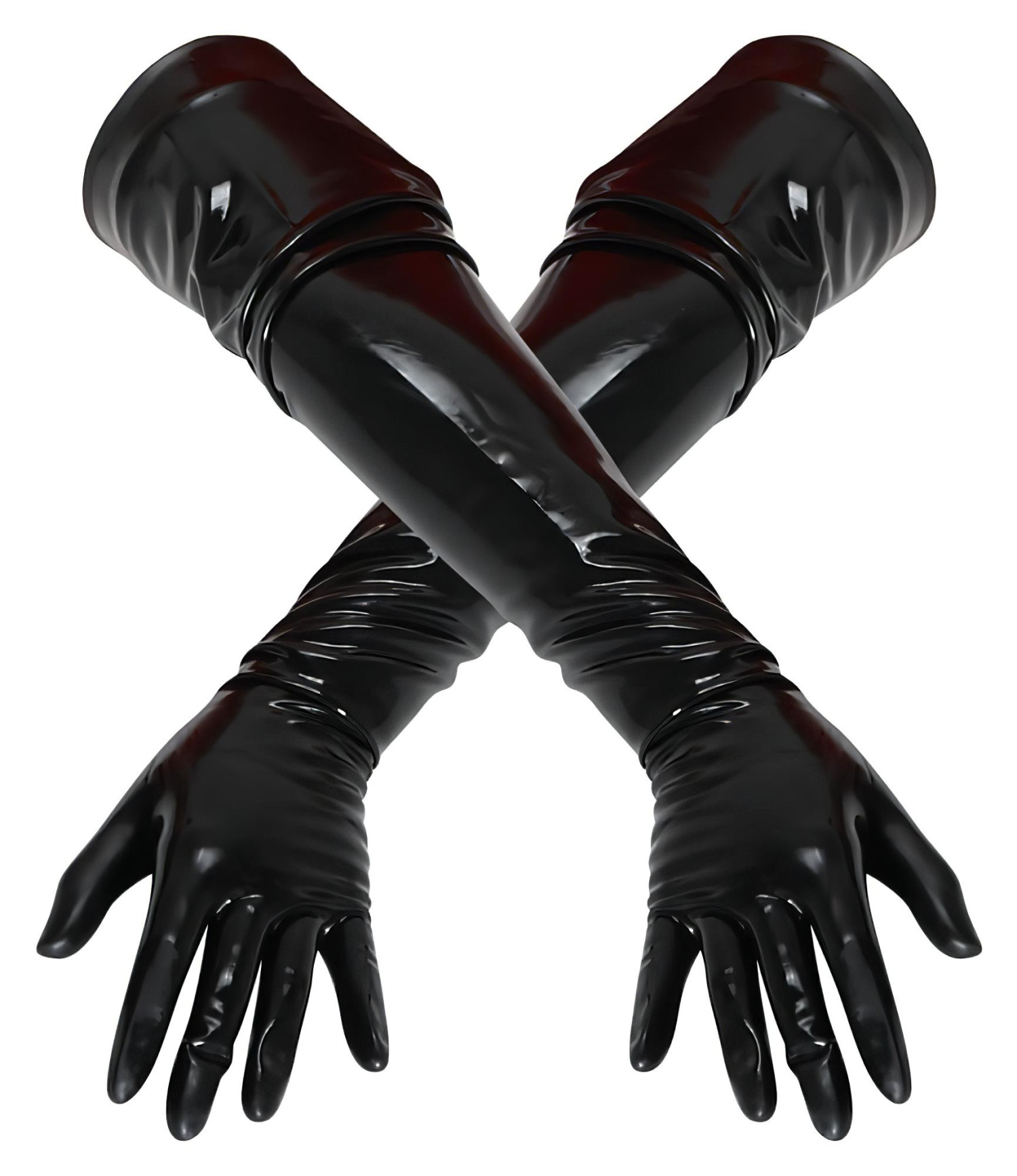 Posuň svůj fetish outfit na novou úroveň s těmito klasickými, dlouhými černými latexovými rukavicemi - vhodné jak pro ženy, tak pro muže!