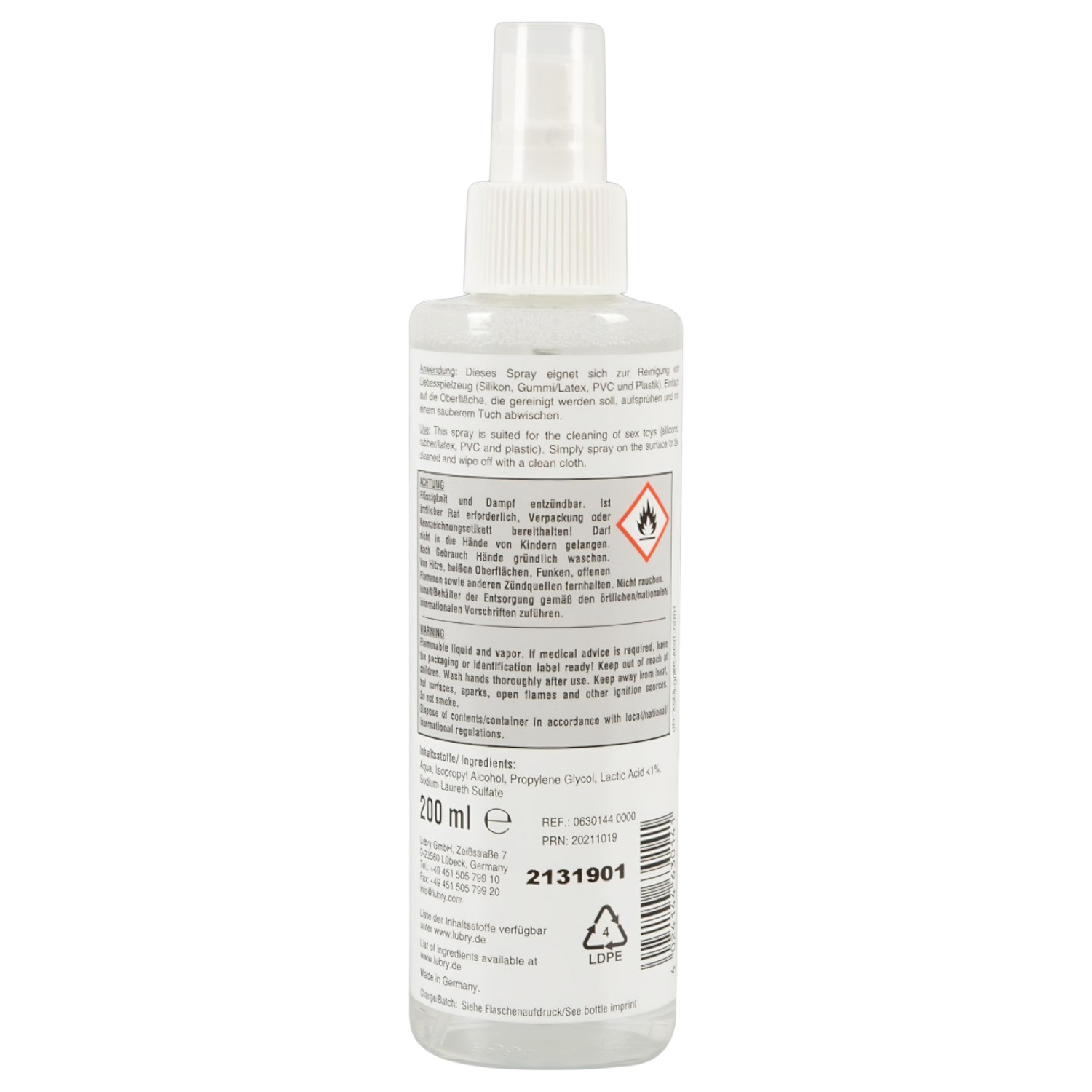 Důkladně opláchni hračku od tělních tekutin a lubrikantu. Nastříkej několik dávek čističe, nech pár minut působit, potom opláchni čistou vodou. Na těžko dostupná místa použij zúžený nástavec nebo brčko.